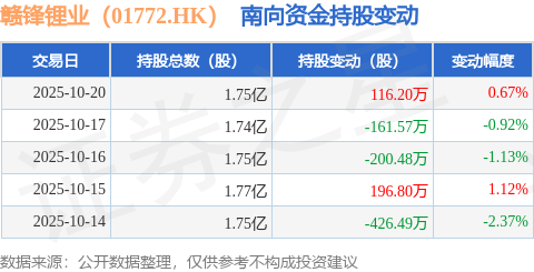 证券之星消息,10月20日南向资金增持116.2万股赣锋锂业(01772.HK)。近5个交易日中,获南向资金减持的有3天,累计净减持475.54万股。近20个交易日中,获南向资金增持的有12天,累计净增持1642.61万股。截至目前,南向资金持有赣锋锂业(01772.HK)1.75亿股,占公司已发行普通股的nan%。