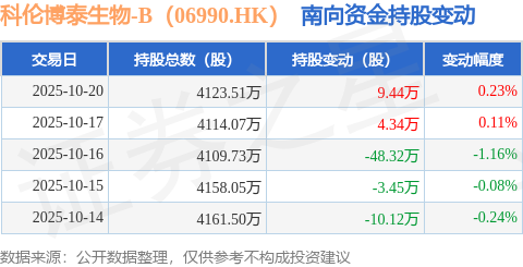 证券之星消息,10月20日南向资金增持9.44万股科伦博泰生物-B(06990.HK)。近5个交易日中,获南向资金减持的有3天,累计净减持48.11万股。近20个交易日中,获南向资金减持的有12天,累计净减持87.05万股。截至目前,南向资金持有科伦博泰生物-B(06990.HK)4123.51万股,占公司已发行普通股的25.32%。