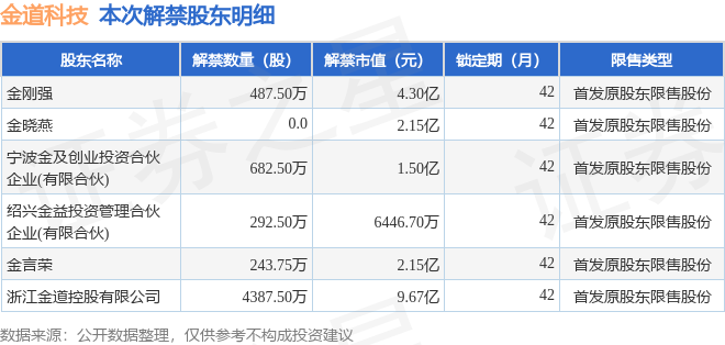 证券之星消息,根据市场公开信息整理,金道科技(301279)于10月21日将有6093.75万股限售股份解禁,为公司首发原股东限售股份,占公司总股本46.97%。(本次数据根据历史公告整理得出,实际情况以上市公司最新公告为准)本次解禁后,公司还有3168.75万股限售股份,占总股本24.42%。具体如下图所示:
