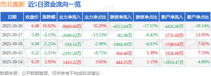 证券之星消息,截至2025年10月20日收盘,市北高新(600604)报收于6.48元,上涨10.02%,涨停,换手率2.74%,成交量38.51万手,成交额2.46亿元。
