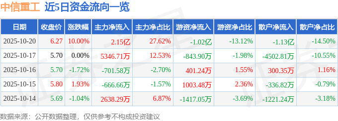 证券之星消息,截至2025年10月20日收盘,中信重工(601608)报收于6.27元,上涨10.0%,涨停,换手率2.78%,成交量126.66万手,成交额7.77亿元。