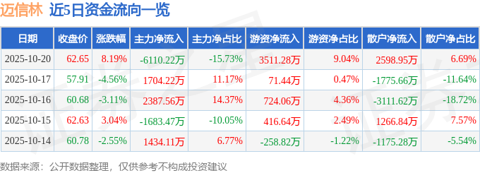 证券之星消息,截至2025年10月20日收盘,迈信林(688685)报收于62.65元,上涨8.19%,换手率4.28%,成交量6.23万手,成交额3.88亿元。