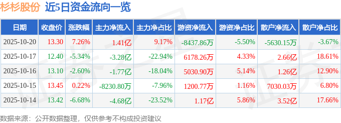 证券之星消息,截至2025年10月20日收盘,杉杉股份(600884)报收于13.3元,上涨7.26%,换手率6.69%,成交量117.63万手,成交额15.34亿元。