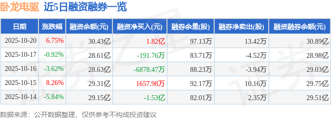 卧龙电驱融资融券信息显示,融资方面,当日融资买入8.46亿元,融资偿还6.64亿元,融资净买入1.82亿元,净买入额两市排名第4。融券方面,融券卖出16.89万股,融券偿还3.47万股,融券余量97.13万股,融券余额4683.61万元。融资融券余额30.89亿元。
