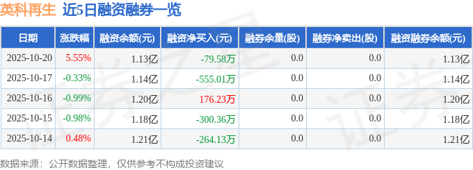 英科再生融资融券信息显示,融资方面,当日融资买入1262.18万元,融资偿还1341.75万元,融资净偿还79.58万元。融券方面,融券卖出0.0股,融券偿还0.0股,融券余量0.0股,融券余额0.0万元。融资融券余额1.13亿元。