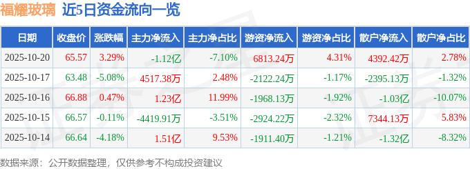 证券之星消息,截至2025年10月20日收盘,福耀玻璃(600660)报收于65.57元,上涨3.29%,换手率1.22%,成交量24.36万手,成交额15.79亿元。