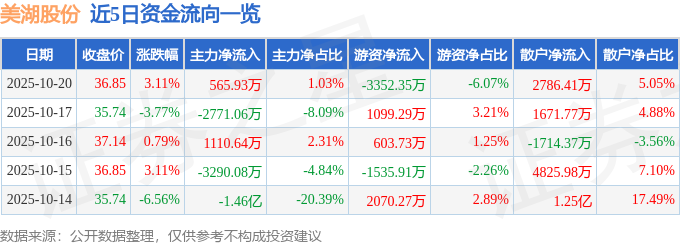 证券之星消息,截至2025年10月20日收盘,美湖股份(603319)报收于36.85元,上涨3.11%,换手率4.39%,成交量14.9万手,成交额5.52亿元。