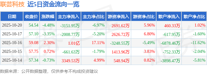 证券之星消息,截至2025年10月20日收盘,联芸科技(688449)报收于54.54元,下跌4.48%,换手率11.7%,成交量8.19万手,成交额4.52亿元。