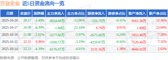证券之星消息,截至2025年10月20日收盘,万业企业(600641)报收于20.17元,下跌3.49%,换手率3.9%,成交量36.28万手,成交额7.41亿元。