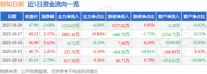 证券之星消息,截至2025年10月20日收盘,容知日新(688768)报收于47.89元,下跌2.68%,换手率4.51%,成交量3.94万手,成交额1.91亿元。