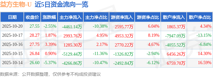 证券之星消息,截至2025年10月20日收盘,益方生物(688382)报收于27.55元,下跌2.55%,换手率3.67%,成交量15.31万手,成交额4.3亿元。