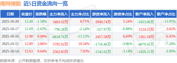 证券之星消息,截至2025年10月20日收盘,南网储能(600995)报收于12.49元,下跌1.58%,换手率0.99%,成交量31.59万手,成交额3.91亿元。