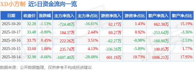 证券之星消息,截至2025年10月20日收盘,XD小方制(603207)报收于32.28元,下跌1.53%,换手率2.49%,成交量1.35万手,成交额4361.07万元。