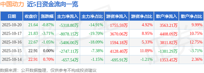 证券之星消息,截至2025年10月20日收盘,中国动力(600482)报收于21.64元,下跌0.87%,换手率0.73%,成交量16.34万手,成交额3.57亿元。