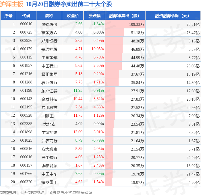 沪深主板融券净卖出前三分别为:包钢股份(600010)融券净卖出109.33万股、京东方A(000725)融券净卖出51.18万股、郑州银行(002936)融券净卖出48.3万股,前20具体见下表: