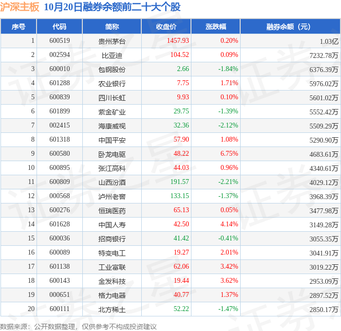 沪深主板融券余额前三分别为:贵州茅台(600519)融券余额1.03亿元、比亚迪(002594)融券余额7232.78万元、包钢股份(600010)融券余额6376.39万元,前20具体见下表: