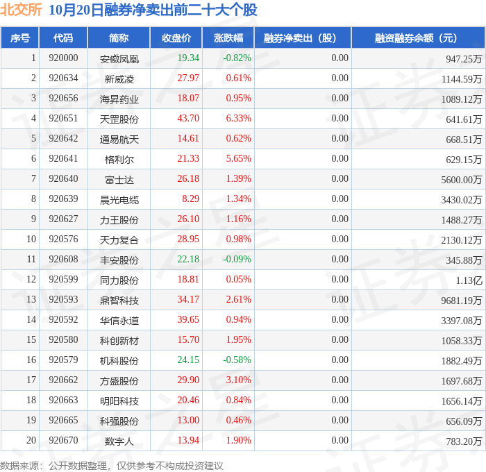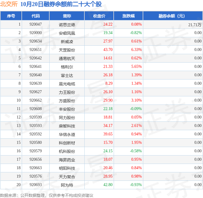 北交所融券余额前三分别为:诺思兰德(920047)融券余额21.71万元,前20具体见下表: