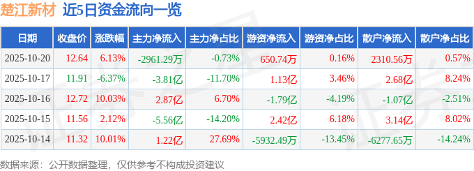 证券之星消息,截至2025年10月20日收盘,楚江新材(002171)报收于12.64元,上涨6.13%,换手率20.31%,成交量327.75万手,成交额40.72亿元。