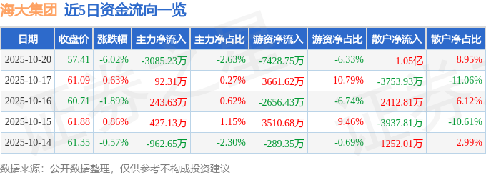 证券之星消息,截至2025年10月20日收盘,海大集团(002311)报收于57.41元,下跌6.02%,换手率1.21%,成交量20.14万手,成交额11.74亿元。