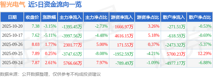 证券之星消息,截至2025年10月20日收盘,智光电气(002169)报收于7.38元,下跌3.15%,换手率9.11%,成交量69.08万手,成交额5.11亿元。