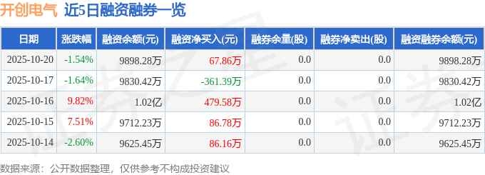 开创电气融资融券信息显示,融资方面,当日融资买入1010.69万元,融资偿还942.83万元,融资净买入67.86万元。融券方面,融券卖出0.0股,融券偿还0.0股,融券余量0.0股,融券余额0.0万元。融资融券余额9898.28万元。