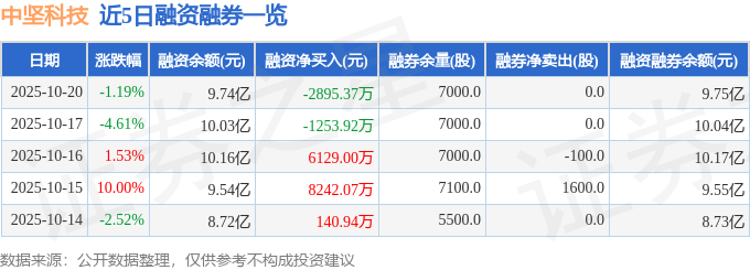 中坚科技融资融券信息显示,融资方面,当日融资买入4646.35万元,融资偿还7541.73万元,融资净偿还2895.37万元。融券方面,融券卖出0.0股,融券偿还0.0股,融券余量7000.0股,融券余额88.41万元。融资融券余额9.75亿元。