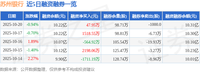 证券之星消息,截至2025年10月20日收盘,苏州银行(002966)报收于8.47元,下跌0.94%,换手率0.88%,成交量38.79万手,成交额3.27亿元。