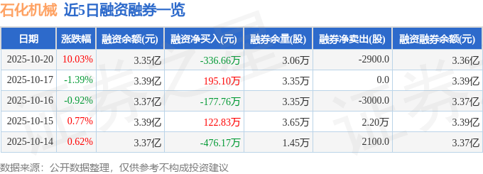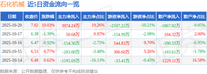 证券之星消息,截至2025年10月20日收盘,石化机械(000852)报收于7.02元,上涨10.03%,涨停,换手率3.25%,成交量30.76万手,成交额2.06亿元。