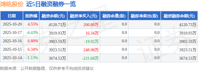 鸿铭股份融资融券信息显示,融资方面,当日融资买入1191.77万元,融资偿还990.97万元,融资净买入200.8万元。融券方面,融券卖出0.0股,融券偿还0.0股,融券余量0.0股,融券余额0.0万元。融资融券余额4120.73万元。