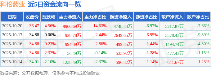 证券之星消息,截至2025年10月20日收盘,科伦药业(002422)报收于36.47元,上涨4.56%,换手率1.44%,成交量18.86万手,成交额6.81亿元。