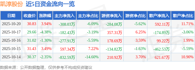 证券之星消息,截至2025年10月20日收盘,凯淳股份(301001)报收于30.83元,上涨3.94%,换手率3.3%,成交量1.66万手,成交额5056.16万元。