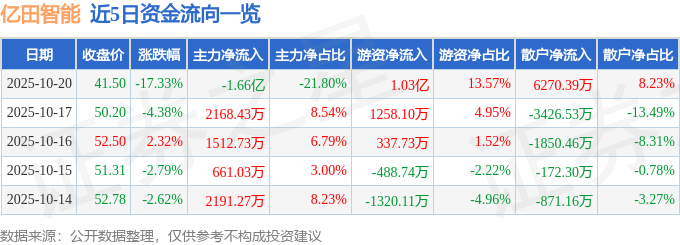 证券之星消息,截至2025年10月20日收盘,亿田智能(300911)报收于41.5元,下跌17.33%,换手率9.99%,成交量17.11万手,成交额7.61亿元。