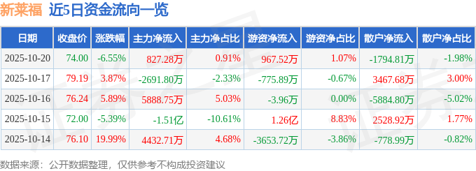 证券之星消息,截至2025年10月20日收盘,新莱福(301323)报收于74.0元,下跌6.55%,换手率18.28%,成交量12.25万手,成交额9.06亿元。