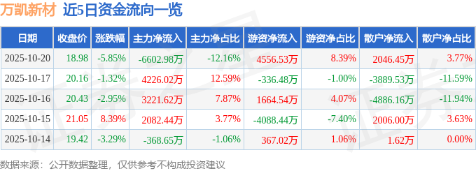证券之星消息,截至2025年10月20日收盘,万凯新材(301216)报收于18.98元,下跌5.85%,换手率5.12%,成交量27.72万手,成交额5.43亿元。