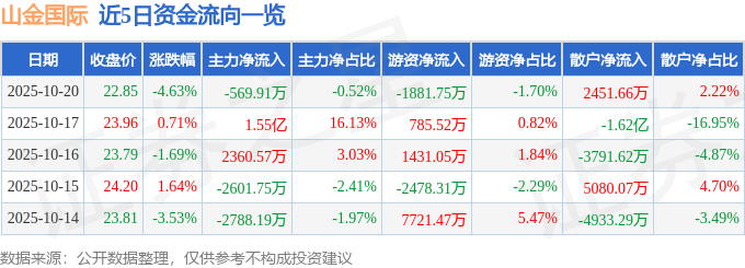 证券之星消息,截至2025年10月20日收盘,山金国际(000975)报收于22.85元,下跌4.63%,换手率1.9%,成交量47.93万手,成交额11.06亿元。