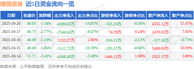 证券之星消息,截至2025年10月20日收盘,捷强装备(300875)报收于46.03元,下跌1.54%,换手率7.26%,成交量6.37万手,成交额2.94亿元。