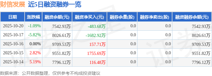 财信发展融资融券信息显示,融资方面,当日融资买入728.67万元,融资偿还1212.35万元,融资净偿还483.68万元。融券方面,融券卖出0.0股,融券偿还0.0股,融券余量0.0股,融券余额0.0万元。融资融券余额7542.93万元。