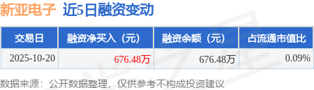证券之星消息,10月20日,新亚电子(605277)融资买入725.27万元,融资偿还48.79万元,融资净买入676.48万元,融资余额676.48万元。