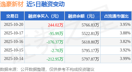 证券之星消息,10月20日,逸豪新材(301176)融资买入723.86万元,融资偿还479.85万元,融资净买入244.02万元,融资余额5766.83万元。