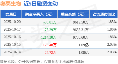 证券之星消息,10月20日,奥泰生物(688606)融资买入122.59万元,融资偿还158.4万元,融资净卖出35.81万元,融资余额9619.5万元。