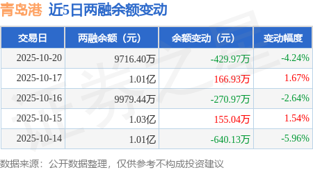 证券之星消息,10月20日,青岛港(601298)融资买入572.85万元,融资偿还991.29万元,融资净卖出418.44万元,融资余额9709.4万元。