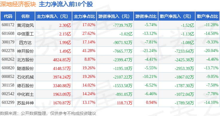 从资金流向上来看,当日深地经济板块主力资金净流入8.44亿元,游资资金净流出4.36亿元,散户资金净流出4.08亿元。深地经济板块个股资金流向见下表: