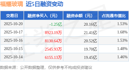 证券之星消息,10月20日,福耀玻璃(600660)融资买入4101.78万元,融资偿还1.66亿元,融资净卖出1.25亿元,融资余额20.16亿元。