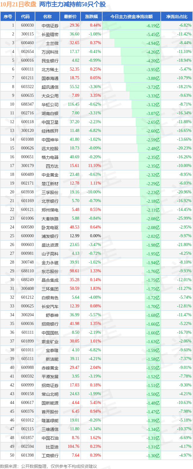 两市主力减持最多的前十只个股为: