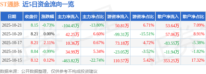 证券之星消息,截至2025年10月21日收盘,ST通脉(603559)报收于8.15元,下跌0.73%,换手率0.23%,成交量9328.0手,成交额756.76万元。