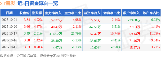 证券之星消息,截至2025年10月21日收盘,ST雪发(002485)报收于3.84元,上涨4.92%,换手率0.62%,成交量3.39万手,成交额1283.01万元。