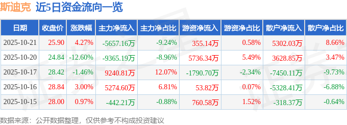 证券之星消息,截至2025年10月21日收盘,斯迪克(300806)报收于25.9元,上涨4.27%,换手率7.59%,成交量24.0万手,成交额6.12亿元。