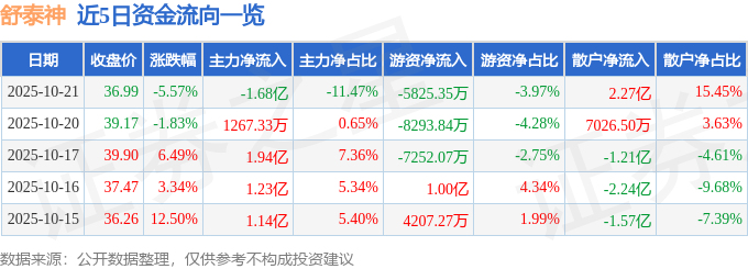 证券之星消息,截至2025年10月21日收盘,舒泰神(300204)报收于36.99元,下跌5.57%,换手率8.71%,成交量39.49万手,成交额14.67亿元。