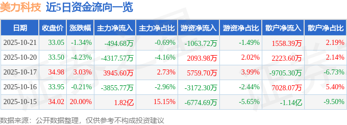 证券之星消息,截至2025年10月21日收盘,美力科技(300611)报收于33.05元,下跌1.34%,换手率14.6%,成交量21.65万手,成交额7.12亿元。