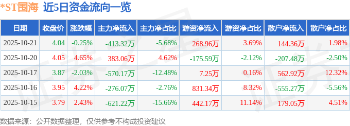 证券之星消息,截至2025年10月21日收盘,*ST围海(002586)报收于4.04元,下跌0.25%,换手率1.99%,成交量17.83万手,成交额7281.46万元。